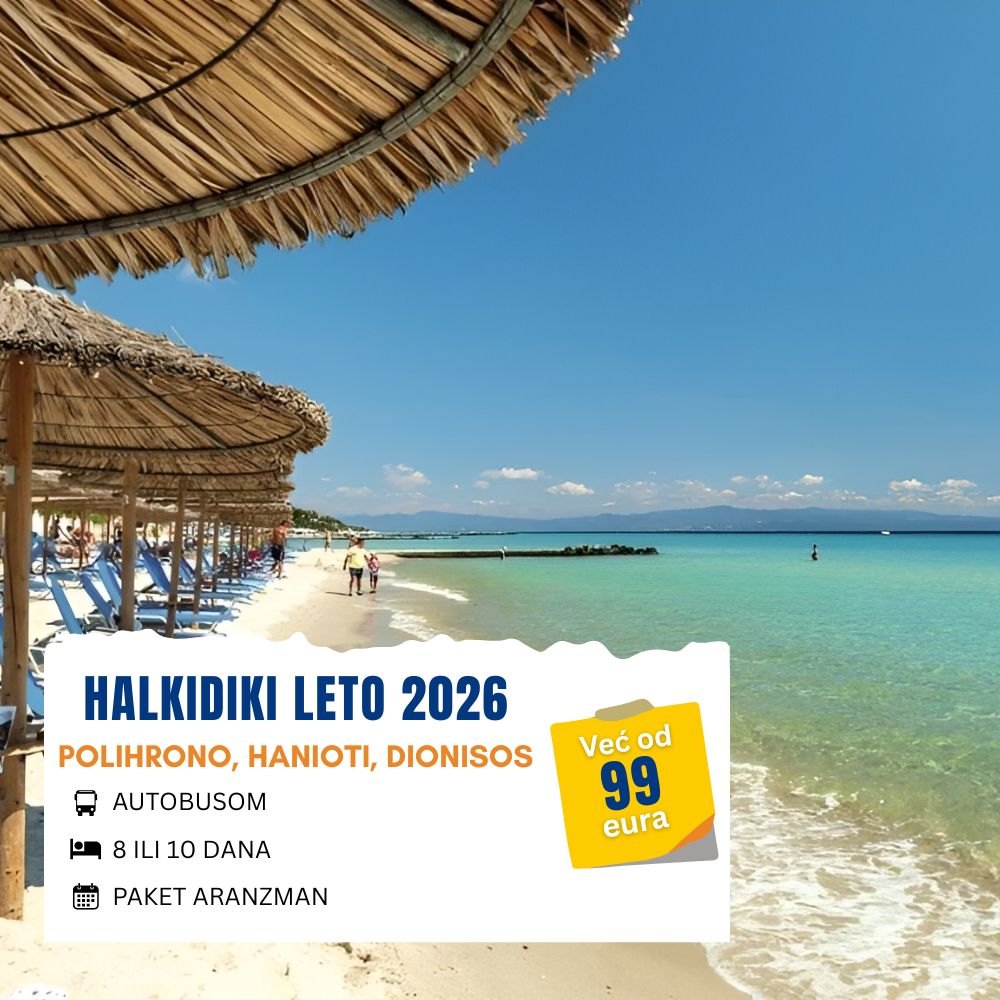 Leto 2026 donosi bogatu i raznovrsnu ponudu letnjih aranžmana u organizaciji turističke agencije Halo Travel. Ova ponuda namenjena je putnicima koji žele kvalitetan, udoban i sadržajan odmor. Ponuda za leto 2026 obuhvata najtraženije destinacije u Grčkoj. Među njima su Olimpska regija, Jonska regija, Halkidiki, Evija, Atina i Krf. Komforni avio-polasci omogućavaju brzo i bezbrižno putovanje.