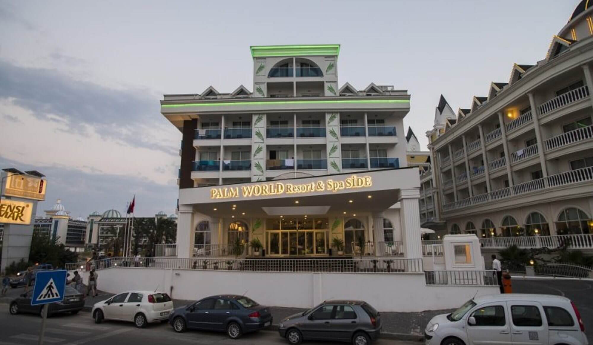 Palm World Side Resort & Spa 5* nalazi se u oblasti Evrenseki, na oko 6 km od centra Sidea i oko 55 km od aerodroma u Antaliji. Usluga u hotelu je all inclusive – samoposluživanje na bazi švedskog stola za doručak, kasni doručak, ručak i večeru, kao i užine tokom dana, uz lokalna alkoholna i bezalkoholna pića u određenim terminima. Hotel poseduje glavni restoran, a la carte restoran (uz rezervaciju), lobi bar, bar pored bazena i snack bar. U okviru hotela nalaze se otvoreni bazeni za odrasle i decu, bazen sa toboganima, terasa za sunčanje i mini klub za decu, kao i dnevni i večernji animacijski program. Gostima su na raspolaganju fitnes, stoni tenis, pikado, sauna i tursko kupatilo, dok se dodatno naplaćuju SPA tretmani, masaže, bilijar i sportovi na vodi. Peščana plaža nalazi se na oko 500 m od hotela, a hotel organizuje besplatan prevoz do plaže. Ležaljke i suncobrani na plaži i pored bazena su besplatni za goste hotela.