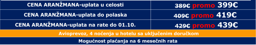 Uplata i plaćanje do polaska: cena aranžmana je 419€ i plaća se na rate do 14 dana pre polaska.