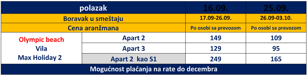 * Dimenzije ležaja u Grčkoj se razlikuju od naših standarda (ležaj/krevet je dužine 185 – 190 cm, a širine, normalan 75 – 90 cm i francuski-bračni 120 – 140 cm). Broj osoba iz cenovnika ne znači i broj kreveta u studiu/apartmanu, već mogućnost da se smesti taj broj osoba, bilo u standardnim bilo u bračnim krevetima.
